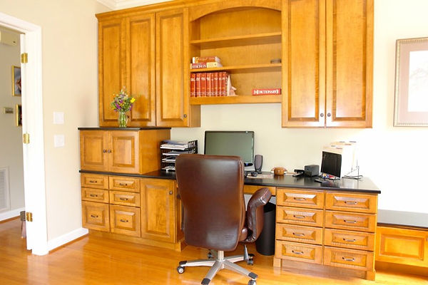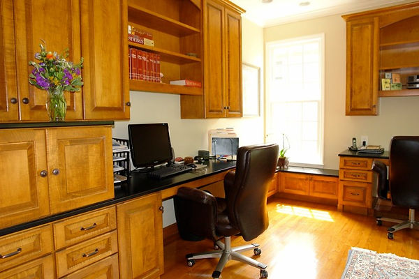With a handsome antique cabinet remaining in the room as our inspiration, our solution was to first put glass double doors across the opening between the front hall & our room, & then design cabinetry to specifically meet the unique needs of both office occupants, as well as the ubiquitous office equipment.